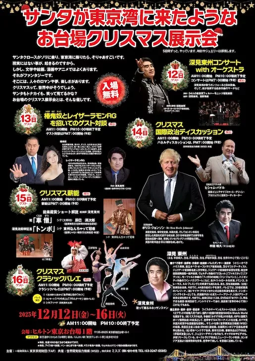 今年の東京芸術財団と株式会社ミスズのクリスマスイベントは、「サンタが東京湾にやって来たようなお台場クリスマス展示会」というタイトルで、12日から16日まで開催される。